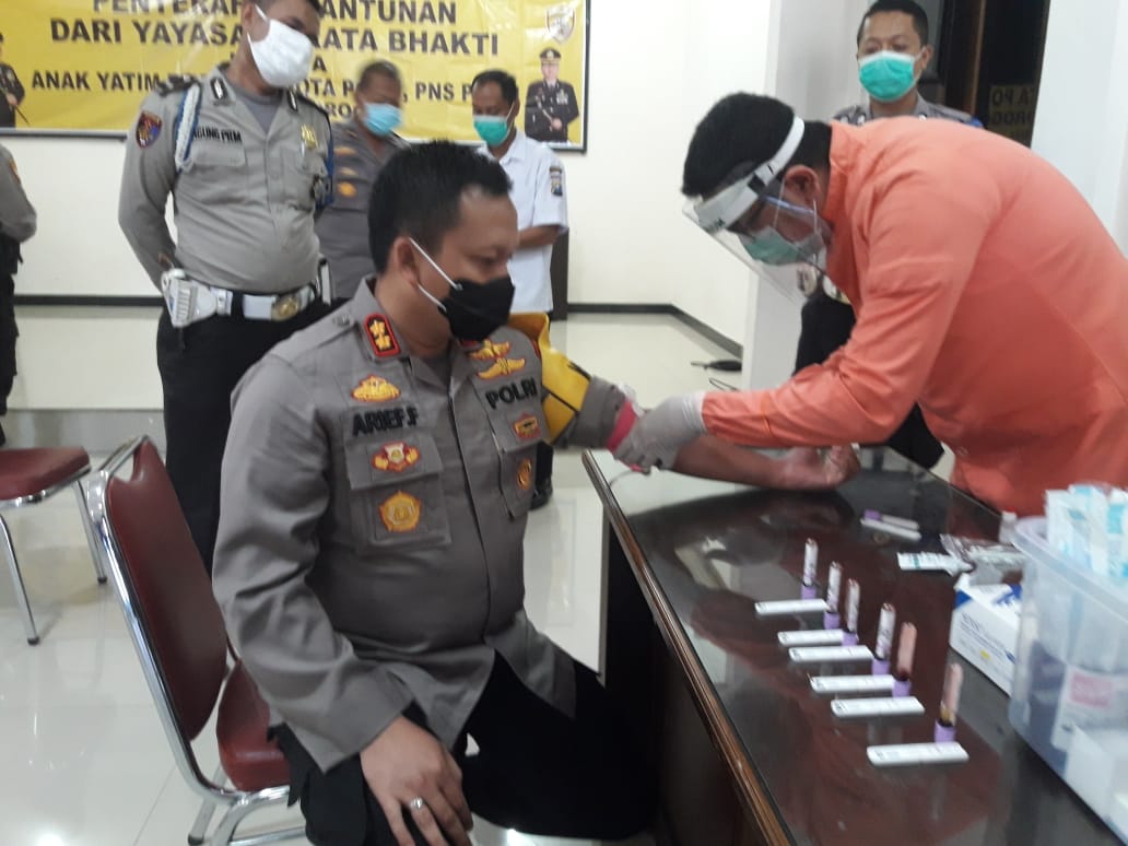 Ponorogo, Seputarkita – Memutus penularan Covid 19, Kapolres Ponorogo AKBP Arief Fitrianto SH, SIK, MM bersama Pejabat Utama Polres Ponorogo melakukan rapid test yang dilaksanakan oleh Biddokkes Polda Jatim di Aula Mapolres setempat, Senen (13/4).