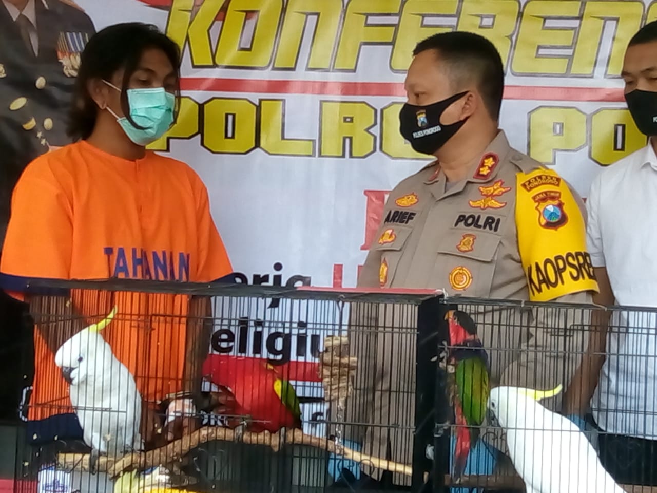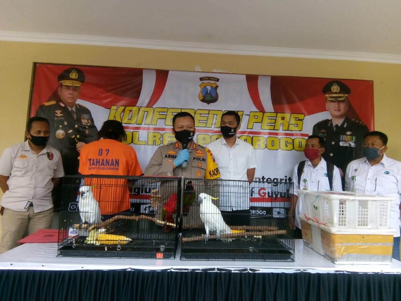 “Dari laporan tersebut, petugas kemudian melakukan penyelidikan dan ternyata benar, serta petugas berhasil mengamankan pelaku di jalan Raya Ponorogo-Madiun tepatnya depan SPBU Desa Pondok Babadan, saat menjual seekor burung Kakak Tua Jambul Kuning melalui media sosial, “kata Arief Fitrianto, saat press release.