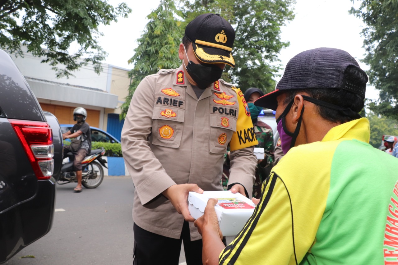 Kapolres Ponorogo AKBP Arief Fitrianto bersama personel TNI-polri bagikan makananan siap saji kepada masyarakat terdampak virus Covid 19