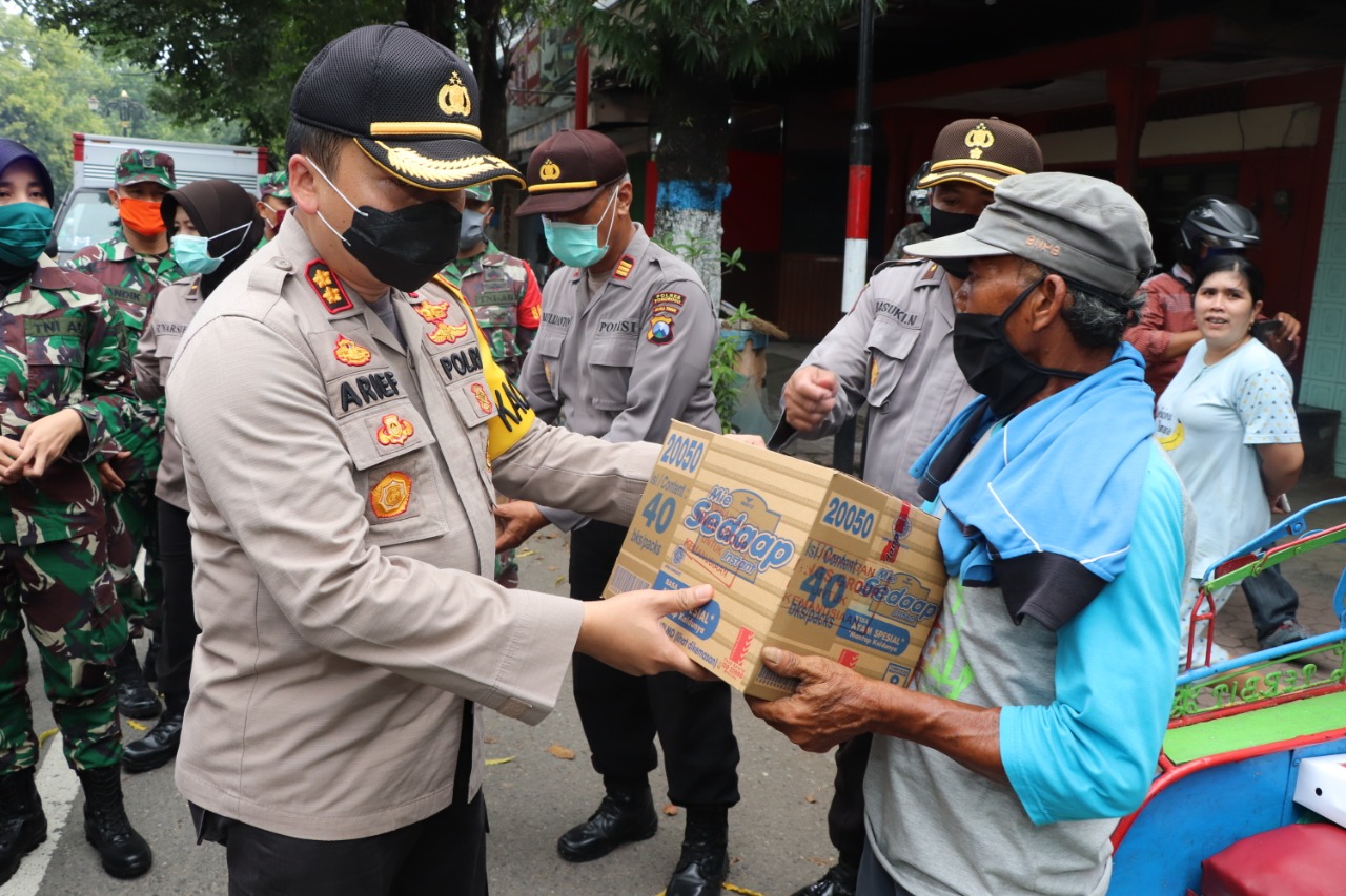Kapolres Ponorogo AKBP Arief Fitrianto bersama personel TNI-polri bagikan paket sembako kepada pengemudi becak dan masyarakat terdampak virus Covid 19