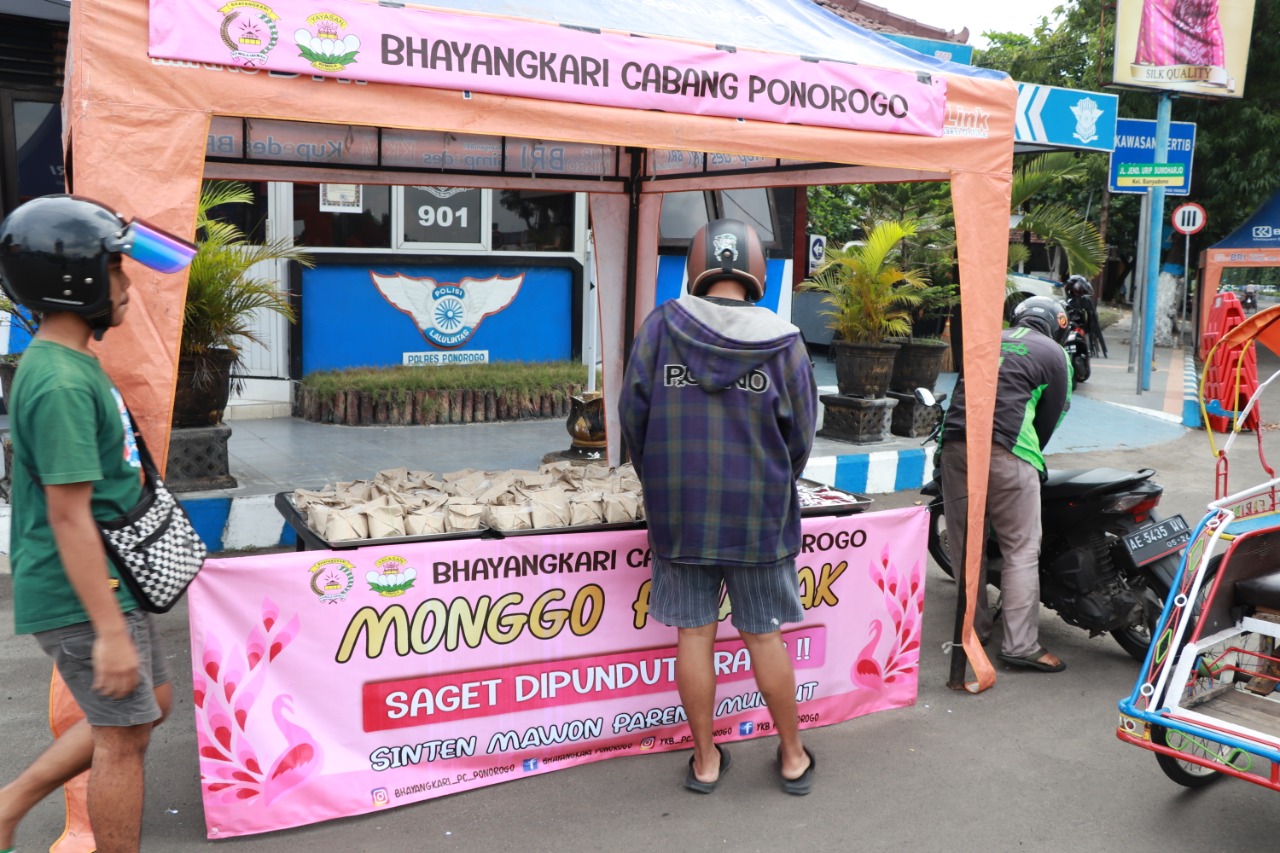 Ponorogo, Seputarkita – Ditengah mewabahnya pandemik virus Covid 19, Bhayangkari Cabang Polres Ponorogo bagi-bagi nasi bungkus dan masker kepada pengguna jalan di perempatan pasar Legi Songgolangit, Kamis (9/4).