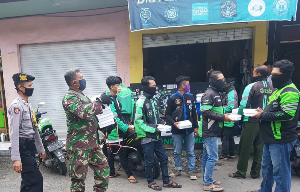 Magetan, Seputarkita – Dengan adanya psyical distancing diwilayah Kecamatan Magetan berdampak ekonomi bagi pekerja informal seperti ojek online, ojek pangkalan dan sopir angkot karena sejak adanya wabah virus corona penghasilan mereka semakin menurun. Keadaan ini membuat Babinsa Candirejo Serda Mujianto dan Bhabinkamtibmas membagikan nasi kotak dari posko dapur lapangan Desa Candirejo kepada warga yang terdampak wabah virus korona yang ada di Kecamatan Magetan. Sabtu (18/04/2020).