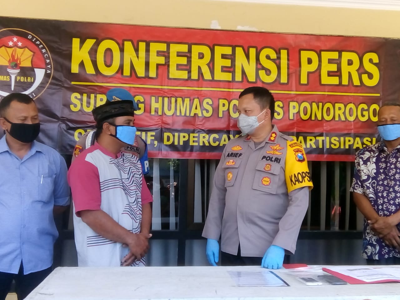 Kapolres Ponorogo AKBP Arief Fitrianto SH, SIK, MM menyampaikan, pelaku diamankan karena telah menyebarkan berita bohong atau hoax di media sosial Facebook tentang pasien warga Ponorogo yang meninggal dunia karena terkena virus Covid 19.