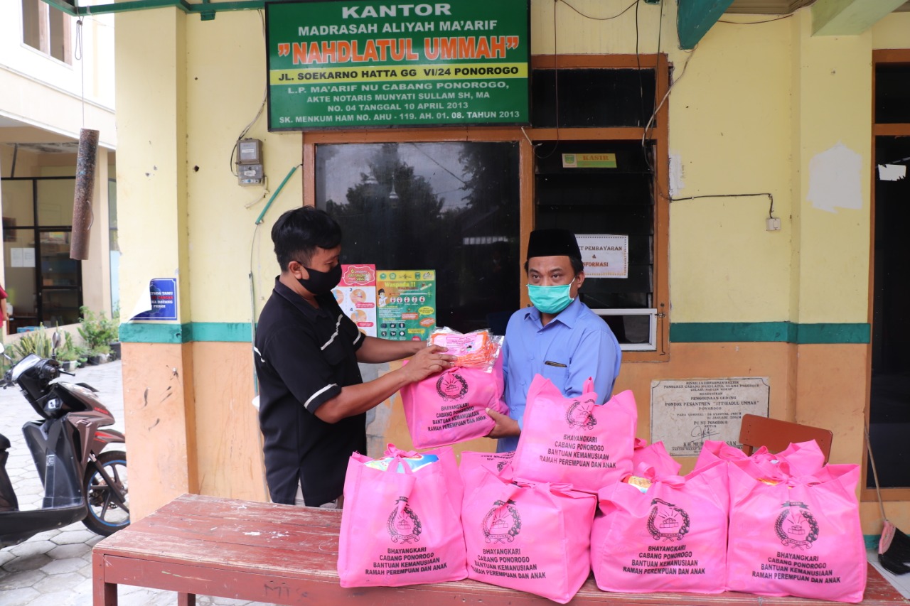 “Mewabahnya pandemik virus Covid 19 membawa dampak ekonomi tidak hanya bagi warga kurang mampu yang tergantung pada pekerjaan sehari-hari, namun juga berdampak Pondok Pesantren Yayasan dan Panti Asuhan, dalam mencukupi kebutuhan anak anak asuhannya. Untuk itu, sebagai wujud kepedulian dan berbagai terhadap sesama, Bhayangkari cabang Ponorogo memberikan paket kepada Pondok Pesantren, Yayasan dan Panti Asuhan di Ponorogo, “kata Ketua Bhayangkari cabang Ponorogo Inanda Arief.