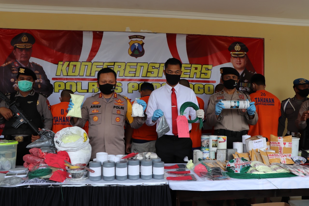 Kapolres Ponorogo AKBP Arief Fitrianto, SIK, SH, MM menyampikan, petugas mengamankan sekitar 6 orang pelaku pembuat dan penjual bahan serbuk petasan atau mercon dengan barang bukti kurang lebih 30 kilogram dari sejumlah wilayah seperti di Kecamatan Kota, Sambit, Sampung dan Badegan.