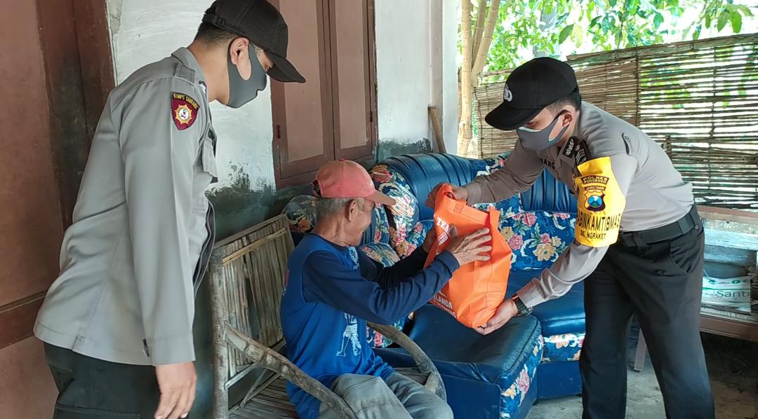 Ponorogo, Seputarkita – Petugas dari Polsek Balong membagikan bantuan paket sembako secara langsung door to door ke rumah-rumah warga yang terdampak pandemik mewabahya virus Covid 19 di Desa Karangan, Kamis (14/5).