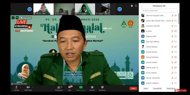 Ponorogo, Seputarkita – Menyongsong kebijakan pemerintah tentang pelaksanaan New Normal yang sudah diujicobakan dan akan diberlakukan Gerakan Pemuda Ansor Ponorogo menggelar dialog interaktif menghadapi Kebijakan New Normal secara virtual melalui aplikasi Zoom Meeting dan Youtube, Minggu (7/6) malam.