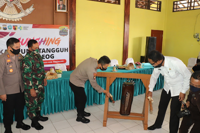 Acara launcing Kampung Tangguh di Kelurahan Tonatan ditandai dengan pemukulan gong oleh oleh Dirpamobvit Polda Jatim Kombes Pol Asep Teddy, SIK, MM, Bupati Ponorogo Drs. H. Ipong Muchlissoni bersama jajaran Forpimda, penyerahan bantuan sembako secara simbolis oleh Dirpamobvit diserahkan kepada sekretaris Kelurahan Tonatan, peninjauan kesiapan Kampung Tangguh di Kelurahan Tonatan dan dilanjutkan launching Kampung Tanggug di Desa Semanding Kecamatan Kauman.(sul)