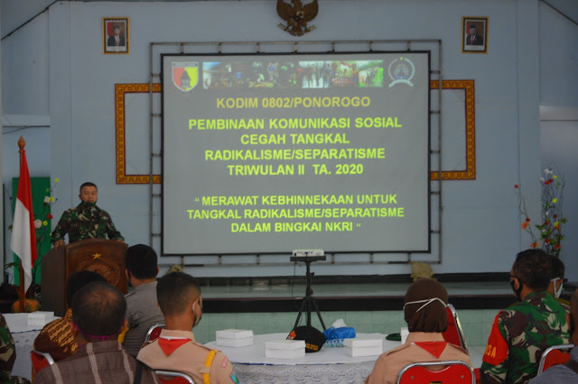Ponorogo, Seputarkita – Komamdo Distrik Militer 0802/Ponorogo menggelar Pembinaan Komunikasi Sosial (Komsos) Cegah Tangkal Radikalisme dan Separatisme triwulan II tahun 2020, yang diikuti Aparat Pemerintah (Apem) Kabupaten Ponorogo di balai prajurit Kodim setempat, Rabu (8/7).