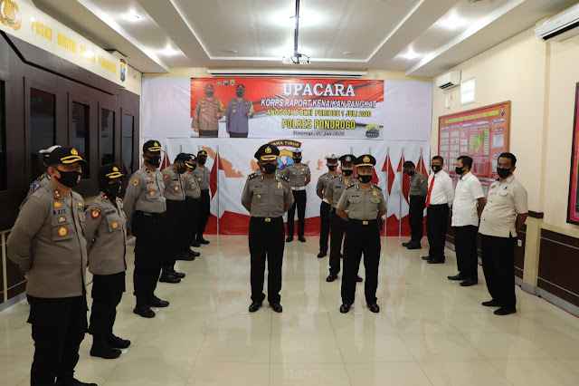 Kapolres Ponorogo AKBP Mochamad Nur Aziz  dalam amanatnya menyampaikan, upacara Korps Raport TMT 1 Juli 2020 dilaksanakan ditengah wabah pandemi Covid 19, melalui video conference dan tetap memperhatikan protokol kesehatan.