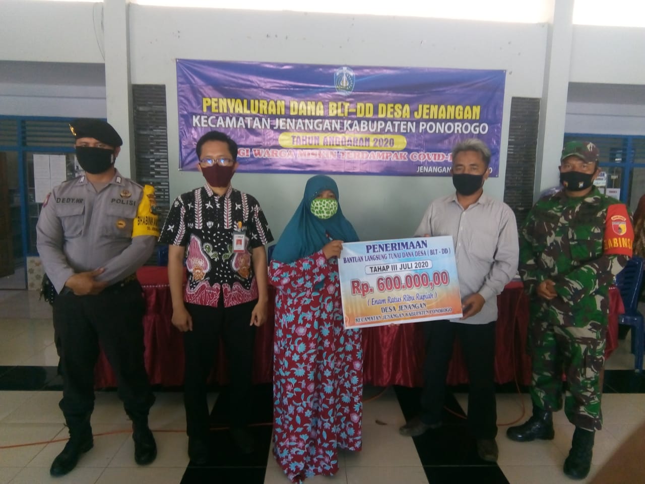 “Untuk penyaluran BLT DD tahap III bulan Junli ini, dikucurkan kepada Keluarga Penerima Manfaat (KPM) yang terdampak secara ekonomi akibat pandemi Covid 19. Penyalurannya kita salurkan secara langsung dan tunai, dengan besarannya sekitar Rp. 600 ribu, dan Alhamdulillah untuk penerimanya sampai saat ini tidak berubah tetap 59 warga yang sumber dananya dari anggaran Dana Desa, “kata Kepala Desa Jenangan Toni Ahmadi.