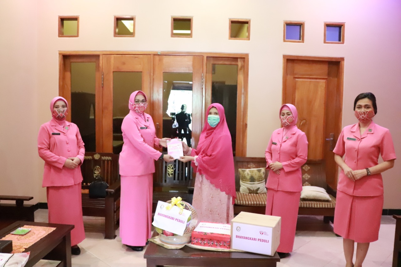 Wakil Ketua Bhayangkari Daerah Jawa Timur Via Slamet Hadi bersama rombongan saat menjenguk isteri anggota yang sakit sekaligus memberikan bantuan kepada keluarga