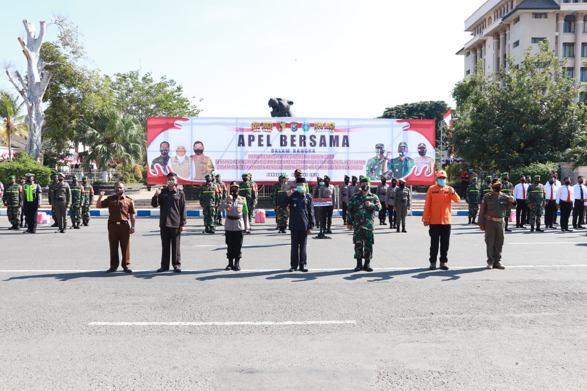 Ponorogo, Seputarkita – Polres Ponorogo bersama Pemkab Ponorogo dan Kodim 0802 Ponorogo menggelar apel bersama dalam rangka implementasi Instruksi Presiden RI Nom 6 tahun 2020 Tentang Peningkatan Disiplin dan Penegakan Hukum Protokol Kesehatan Dalam Pencegahan dan Pengendalian Covid 19 di depan patung macan kawasan alun-alun Utara, Senen (24/9).
