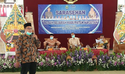 Dalam sambutannya Bupati Magetan Dr. Drs Suprawoto, SH. MSI mengatakan, sarasehan di pendopo ini, saya meminta sekolah-sekolah di Magetan membuat tulisan sejarah sekolahnya sendiri. “Contohnya ada sekolah sejarah SMP 1 Magetan SMP 4, SMP 1 Maospati dan seterusnya dulukan di sekolah itu ada sejarah sejarahnya sendiri kemudian juga desa setiap desa membuat sejarah desa desanya sendiri sehingga termuat suatu kompilasi menjadi sejarah peta Desa/kelurahan diseluruh Kabupaten Magetan,”terang Bupati Suprawoto.
