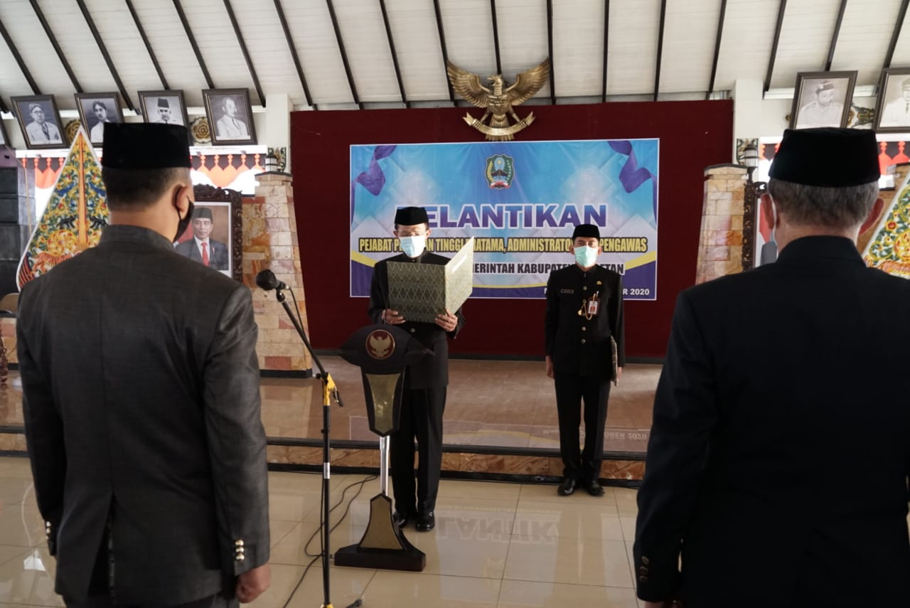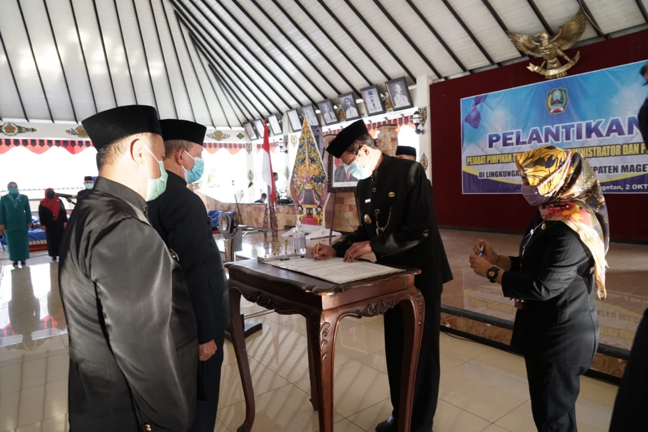 Magetan, Seputarkita – Bupati Magetan Suprawoto melantik dan mengambil sumpah sejumlah pejabat Pimpinan Tinggi Pratama (Eselon II), pejabat Administrator (Eselon III) dan pengawas dilakukan di lingkungan Pemerintah Kabupaten (Pemkab) Magetan. Jum’at (2/10/2020).