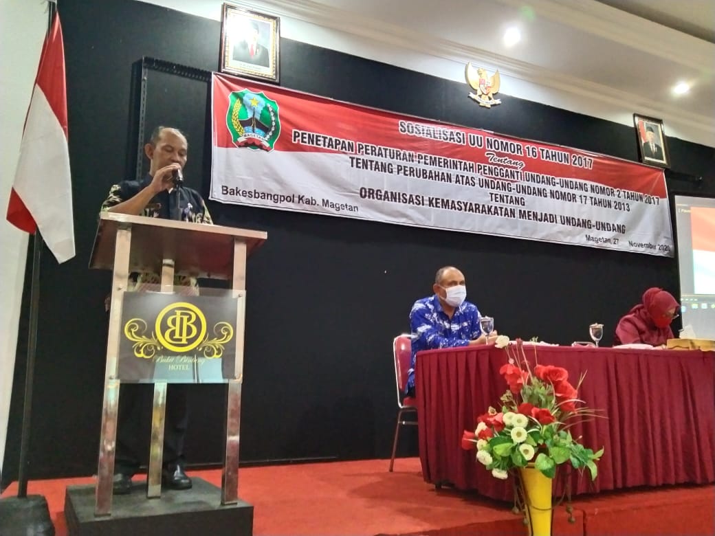 Plt Bakesbangpol Kab. Magetan Drs. Iswahyudi Yulianto,MSI mengatakan, Sosialisasi UU RI No 16 Th 2017 Tentang Penetapan Peraturan Pemerintah Pengganti UU No 2 Th 2017 tentang Perubahan Atas UU No 17 Th 2013 tentang Organisasi Kemasyarakatan Menjadi UU Bupati Magetan bertujuan untuk memberikan pemahaman tentang isi dari UU tersebut sehingga Ormas yang ada di Kabupaten Magetan dapat berjalan sesuaui peraturan yang ada.