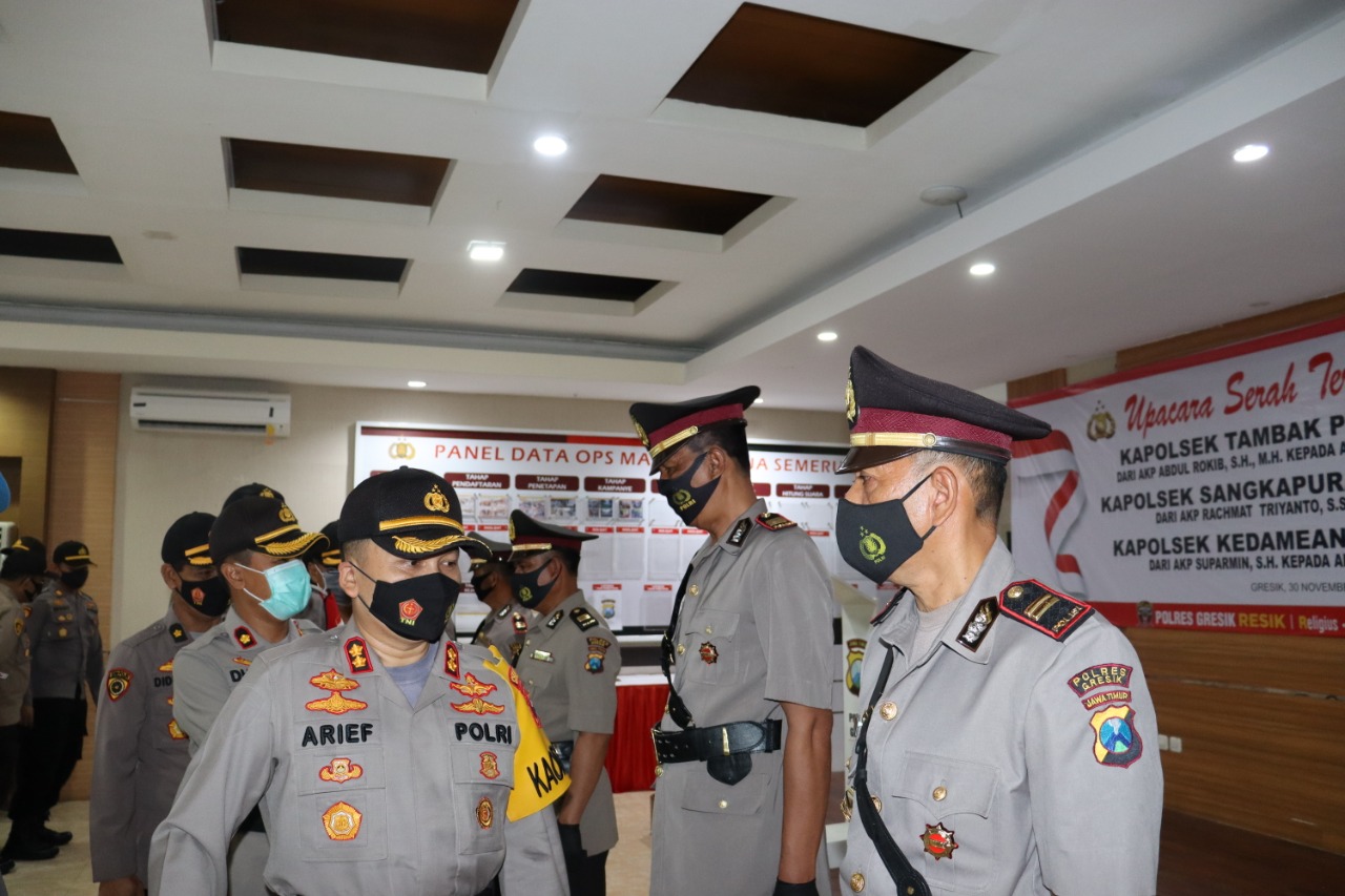 SeputarKita, Gresik, – Kapolres Gresik AKBP Arief Fitrianto, SH SIK M.M., pimpin serah terima jabatan tiga Kapolsek di jajaran Polres Gresik yakni, Kapolsek Kedamean, Kapolsek Tambak dan Kapolsek Sangkapura bertempat di aula Polres Gresik, Senin (30/11/2020).