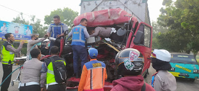 Sunaryo sopir Truk Tronton Box terjepit di kabinnya, dengan cepat petugas Lakalantas melakukan evakuasi kepada korban dan membawa ke Rumah Sakit guna dilakukan pertolongan dan dimintakan visum. Korban Sunaryo mengalami luka terbuka pada kaki kanan dan memar pada kaki kiri dan dalam keadaan sadar.