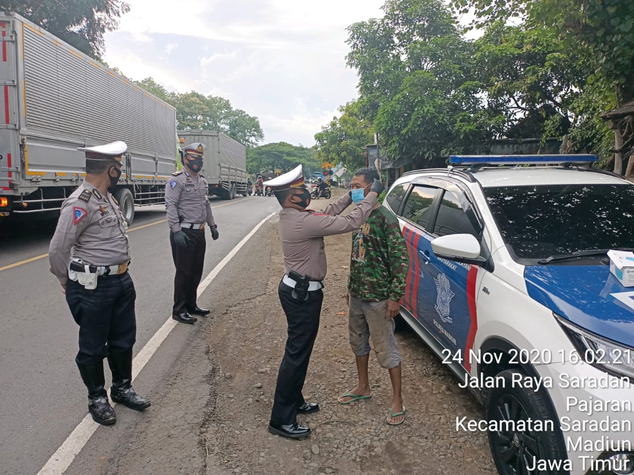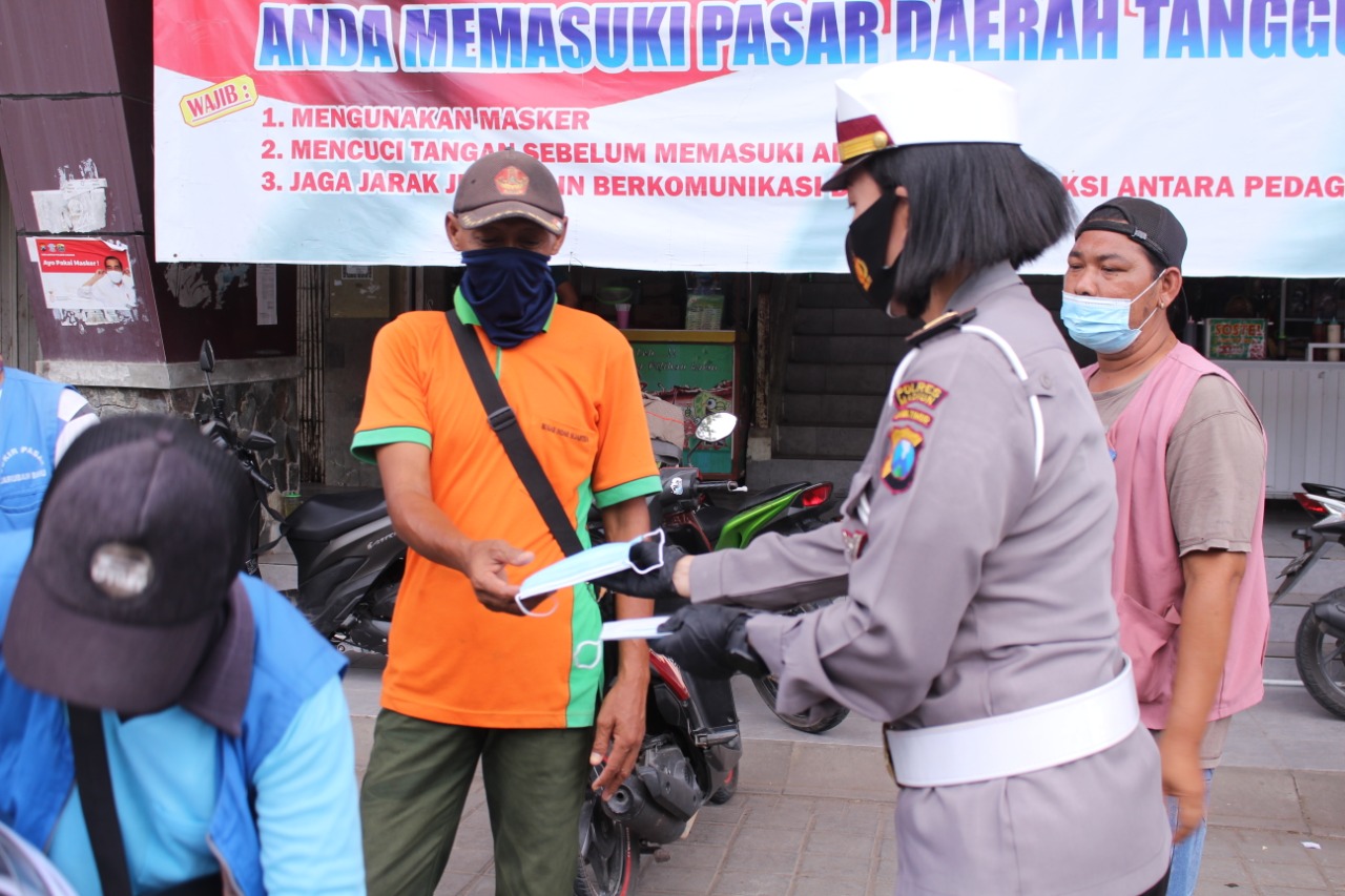 SeputarKita, Madiun – Kapolres Madiun AKBP Bagoes Wibisono melalui Kasat Lantas AKP Ari Bayuaji menyampaikan bahwa Satuan lalu Lintas (Satlantas) Polres Madiun, gencar melaksanakan pembagian masker kepada masyarakat. Kegiatan ini berlangsung di jalan raya Surabaya-Madiun, Kecamatan Saradan, Kabupaten Madiun.