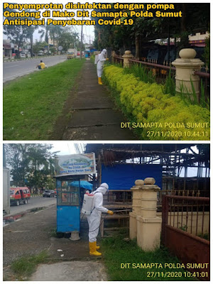 “Seperti hari ini Direktorat Samapta Polda Sumut melaksanakan penyemprotan disinfektan di beberapa lokasi di kota Medan sekaligus juga membagikan masker gratis m, serta melakukan penghimbauan dan ops yustisi kepada masyarakat agar tetap ingat mematuhi anjuran protokol kesehatan saat beraktifitas di luar rumah” kata KBP Tatan Dirsan.