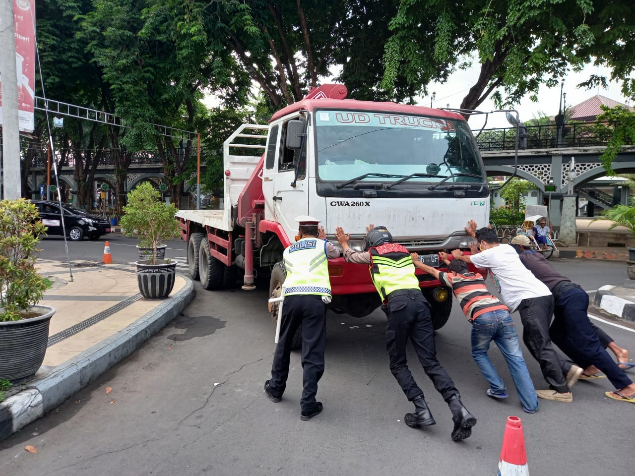 Ditengah tugasnya Dua Anggota Polres Gresik, Respon Aiptu Djono bersama Bripda Agus langsung ikut membantu mendorong truck yang mogok dijalan KH Wakhid Hasyim,Kelurahan Bedilan Kecamatan Gresik Kabupaten Gresik, Selasa (1/12/2020).