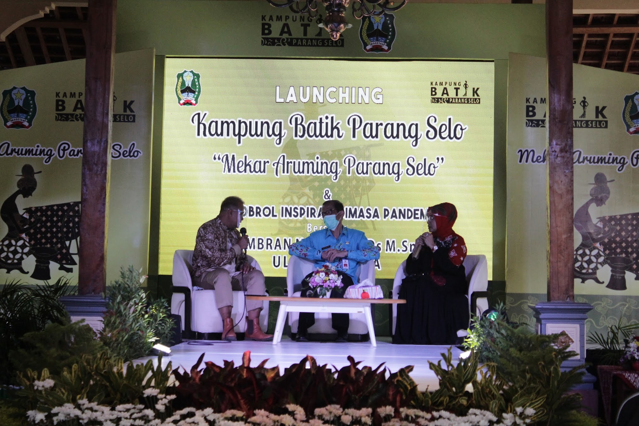 Selain melaunching Kampung Batik, juga diselenggarakan talkshow dengan tema ” Ngobrol Inspirasi di Masa Pandemi” bersama desainer Ulfa Mumtaza dan Embran Nawawi, S.Ds, M.Sn di halaman pendopo Desa Pragak. (WW/Red).