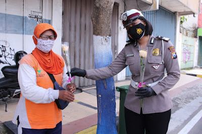 Selain sembako dan bunga, Polwan Satlantas Polres Madiun juga membagikan masker dan handsanitizer.