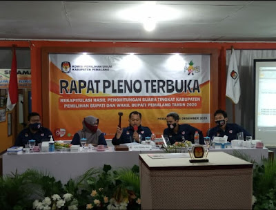 “Rekapitulasi hasil penghitungan suara tingkat kabupaten, pada pemilihan Bupati dan Wakil Bupati Pemalang tahun 2020. Dengan mengucap bismillahirahmanirahim, kami tetapkan!,” tegas Ketua KPU Pemalang, Mustaghfirin.