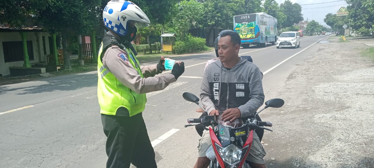 SeputarKita Madiun – sebagai upaya mencegah penyebaran Covid-19 di Kabupaten Madiun, Satlantas Polres Madiun terus membagikan masker kepada masyarakat, Senin (14/12/2020).