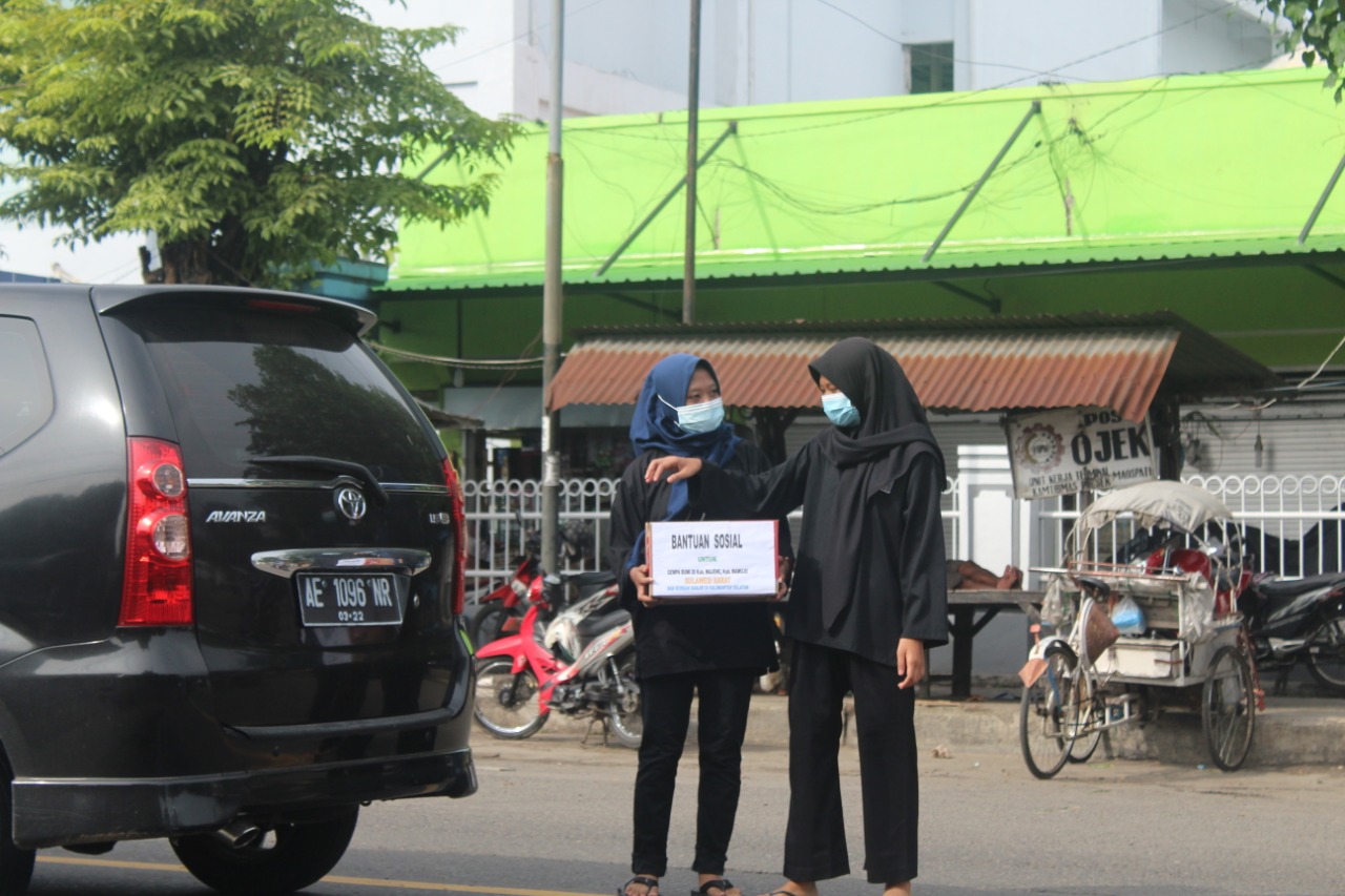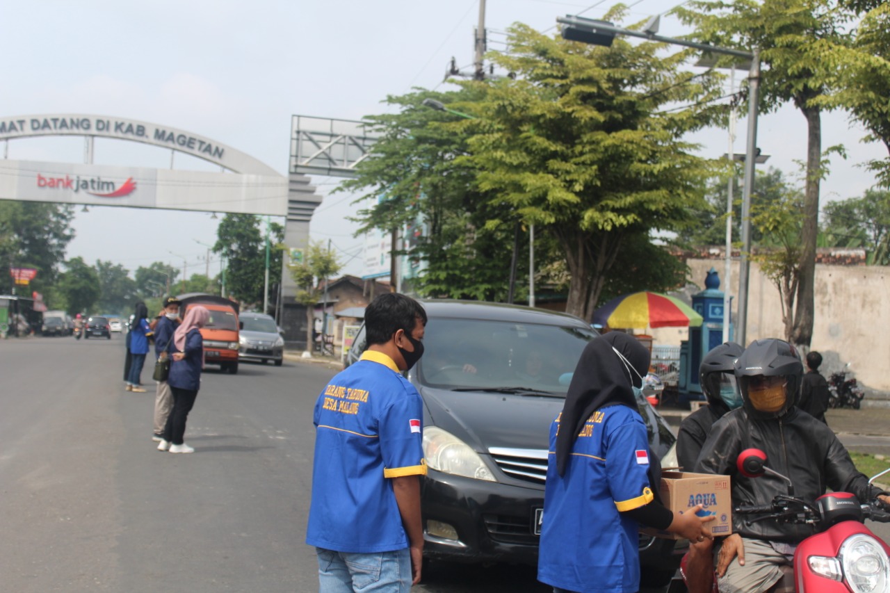 Puluhan Anggota Karang Taruna dan warga PSHT rayon Malang menyebar di Traffic Light simpang tiga terminal Maospati, dengan tetap menerapkan protokol kesehatan.