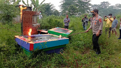 SeputarKita, Medan – Usai melakukan konpers tentang keberhasilan pengungkapan kasus penganiayaan dan pencurian dengan pemberatan di dalam rumah, Kapolsek Sunggal Kompol Yasir Ahmadi SH, SIK, MH, dengan didampingi Kanit Reskrim AKP Budiman Simanjuntak SE, MH dan Panit Reskrim Iptu M. Sofi SH selanjutnya melakukan pemusnahan barang temuan hasil tangkapan Tekab Polsek Sunggal berupa 10 (sepuluh) unit mesin permainan judi dengan cara menyiram minyak kemudian dibakar hingga habis seluruhnya.