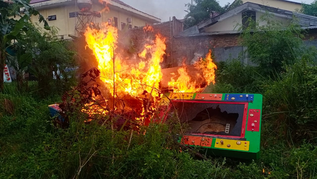 SeputarKita, Medan – Usai melakukan konpers tentang keberhasilan pengungkapan kasus penganiayaan dan pencurian dengan pemberatan di dalam rumah, Kapolsek Sunggal Kompol Yasir Ahmadi SH, SIK, MH, dengan didampingi Kanit Reskrim AKP Budiman Simanjuntak SE, MH dan Panit Reskrim Iptu M. Sofi SH selanjutnya melakukan pemusnahan barang temuan hasil tangkapan Tekab Polsek Sunggal berupa 10 (sepuluh) unit mesin permainan judi dengan cara menyiram minyak kemudian dibakar hingga habis seluruhnya.