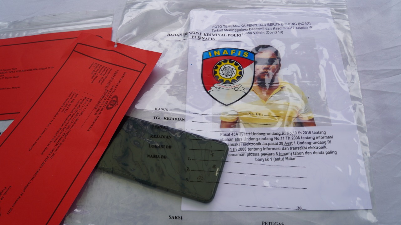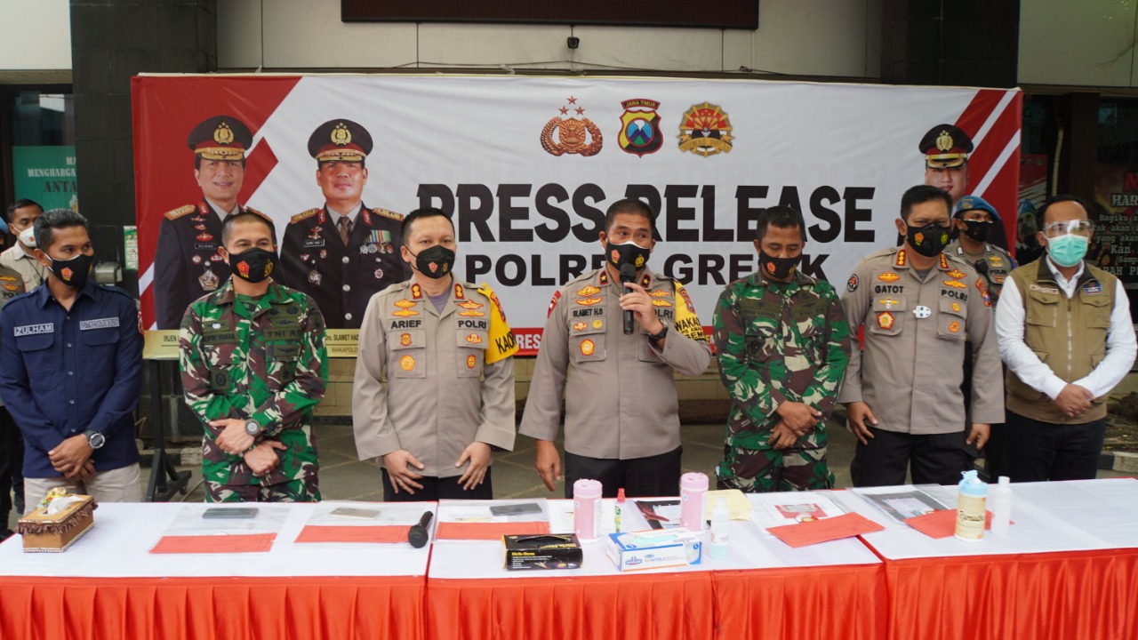 Pada Kesempatan tersebut Wakapolda Jatim Brigjen Pol Drs. Slamet Hadi Supraptoyo menyampaikan bahwa jajaran cyber crime Polda dan Polres Gresik telah berhasil mengamankan seorang Tersangka inisal TS, Lk, 44 Th, WNI yang di duga melakukan pelanggaran UU RI No. 19 Th. 2016 pasal 45A ayat 1, Jo pasal 28 Ayat 1 UU RI No. 19 Th. 2008.