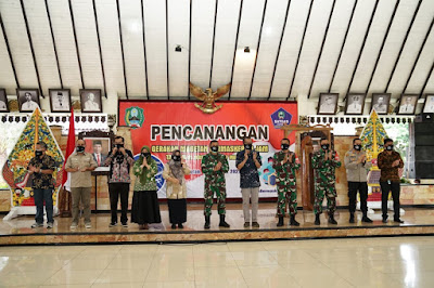 Pencanangan gerakan memakai masker dilaksanakan secara serentak di seluruh Kecamatan di Kabupaten Magetan, dan dipusatkan di Pendopo Surya Graha Magetan dan di tayangkan secara virtual, Minggu (21/2/2021).
