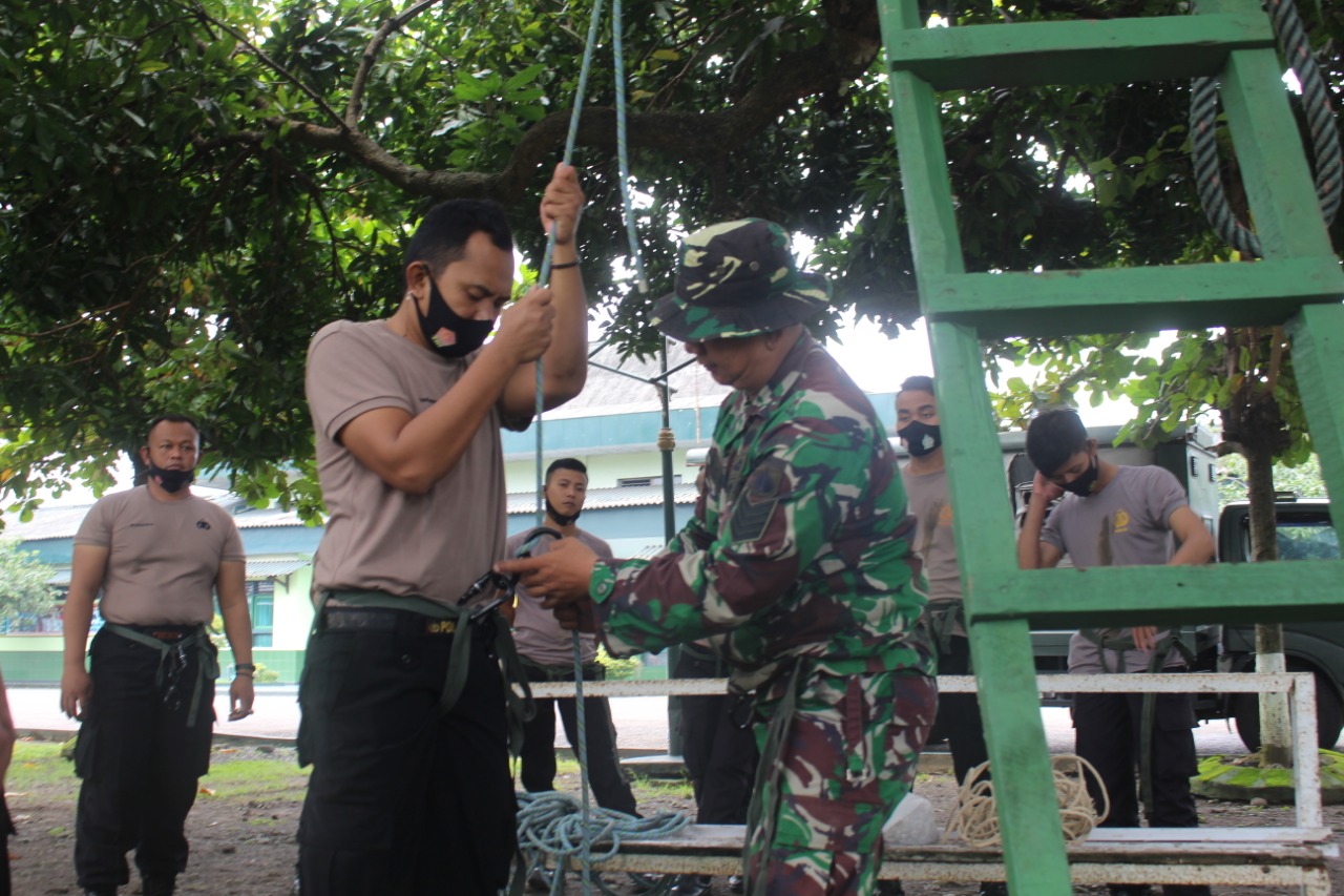 Latihan bersama kali ini dengan materi tali-temali , rayapan tali satu dan rapling diberikan oleh instruktur Serma Dwijo yang didampingi oleh Pasiopsdim 0711/Pemalang Kapten Arm Eko Budiharjo.