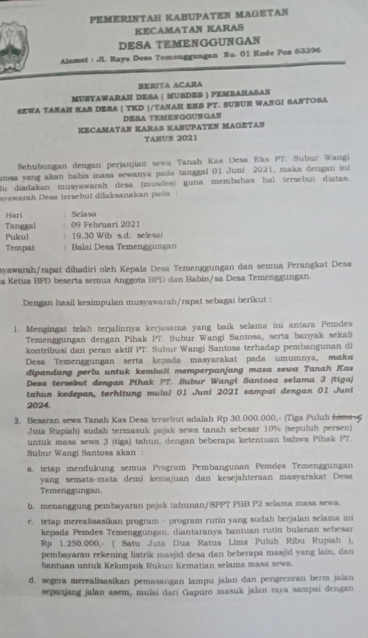 “Untuk tahun 2021 ini ada tambahan lagi pengecoran jalan Asem, mulai pintu masuk desa Temenggungan sampai depan SMA 1 Karas. Karena pertimbangan banyaknya keuntungan dan kontribusi dari pabrik itulah akhirnya dalam musyawarah desa disepakati perpanjangan sewa Tanah Kas Desa tersebut.” Tegasnya.