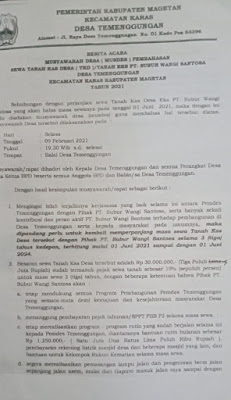 “Setiap tiga tahun sekali kita perbarui kontrak sewa tanah dengan pabrik, sebelum kontrak habis pemerintah Desa Temenggungan menggelar musyawarah desa untuk membahas apakah dilanjutkan atau tidak kontraknya.” Ucap Suwito.