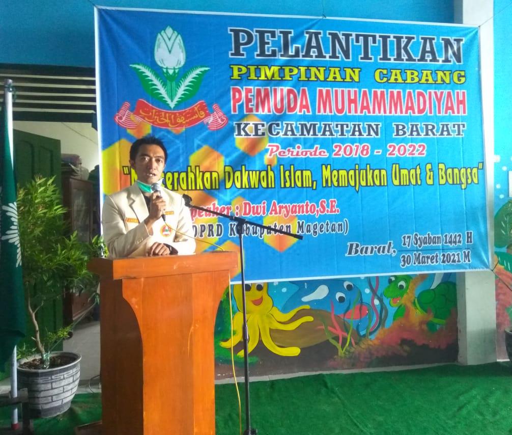 SeputarKita, Magetan – Pimpinan Daerah Pemuda Muhamadiyah (PDPM) Kabupaten Magetan menggelar pelantikan pengurus baru Pimpinan Cabang Pemuda Muhamadiyah kecamatan Barat periode 2018-2022. yang di selenggarakan di aula Sekolah Dasar Muhamadiyah, Kecamatan Barat dengan mengambil tema “Pencerahan dakwah Islam memajukan umat dan bangsa” dengan Keynote Speaker anggota DPRD kabupaten Magetan Dwi Aryanto SE, selaku pembicara kehormatan. Selasa (30/03/2021).