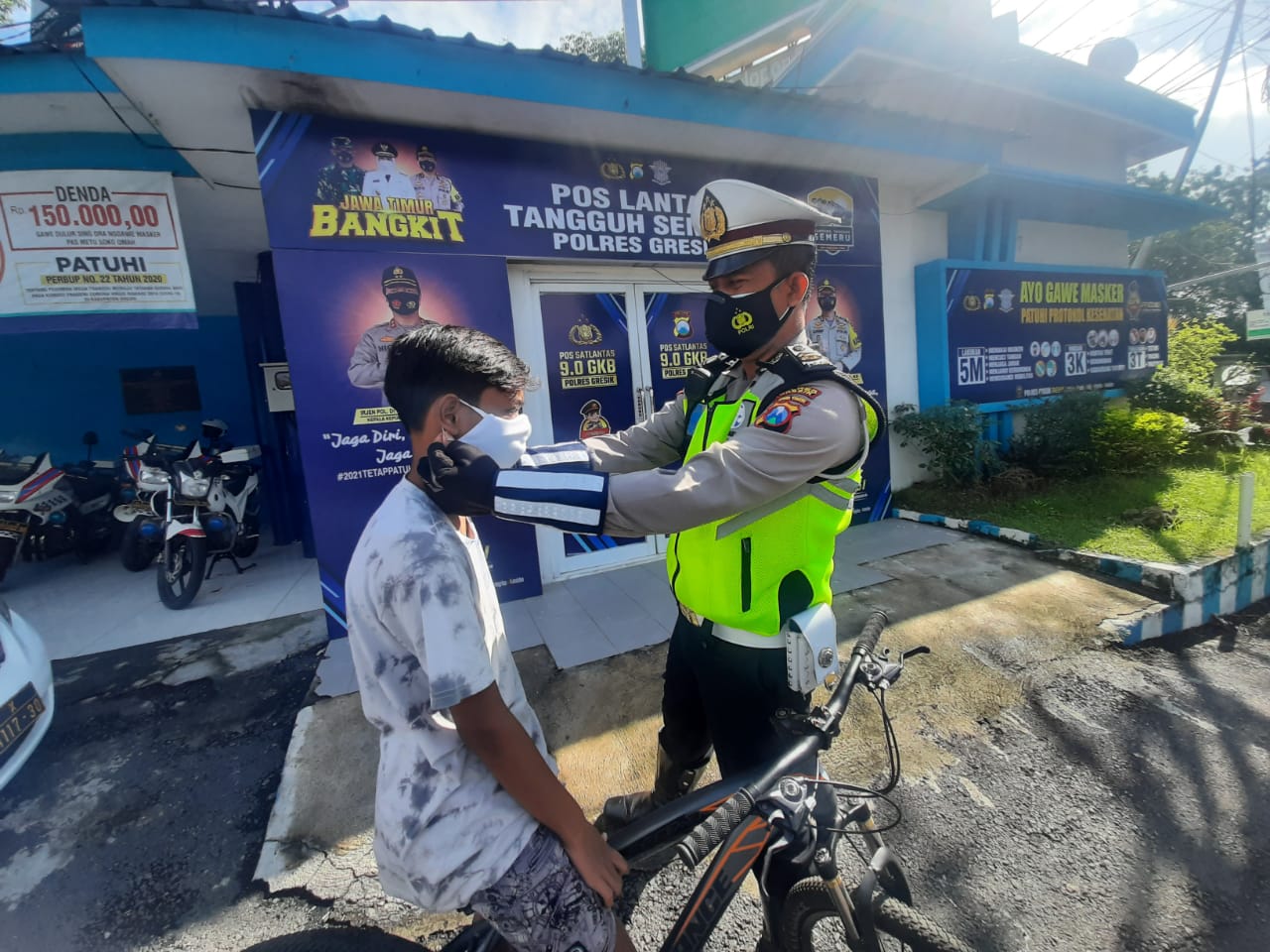 Kapolres Gresik AKBP Arief Fitrianto, S.H., S.I.K., M.M. melalui Kasat Lantas Polres Gresik AKP YANTO MULYANTO P., SH., S.I.K menuturkan bahwa pagi ini satlantas telah membagikan Masker sebanyak 500 kepada para pengguna jalan dan Pemasangan Stiker ” AYO PAKAI MASKER” kepada pengendara R2 maupun R4 kegiatan tersebut dilaksanakan di jln. Wahidin depan pos GKB Kec.Kebomas Kab.Gresik semua itu dilakukan dengan tujuan mendukung peraturan dan kebijakan Pemerintah dalam PPKM untuk memutus mata rantai penyebaran Covid-19.