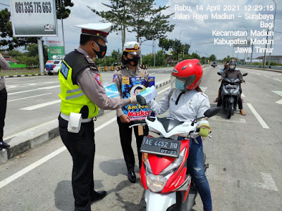 OPS KESELAMATAN SEMERU 2021, SATLANTAS POLRES MADIUN GENCAR BAGIKAN MASKER DAN TAKJIL SERTA SOSIALISASI PROKES DAN LARANGAN MUDIK
