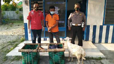 Selain kambing betina jenis gibas, petugas juga mengamankan seutas tali tampar sepanjang 2 meter, satu unit motor matic warna putih dan satu keranjang kayu sebagai barang bukti.