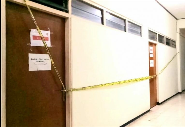 Nampak terbentang Polis line berwarna kuning bertuliskan Bareskrim Polri berderet sepanjang tiga pintu/ruangan bagian dari BKD.