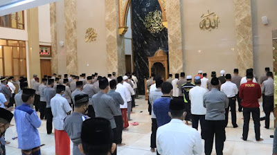 Pantauan dilokasi selesai peresmian Masjid para tamu dan jajaran Polres Tuban langsung melaksanakan sholat Maghrib berjamaah dilanjutkan sholat isya dan Sholat sunah Tarawih bersama di Masjid baru tersebut. (Den)