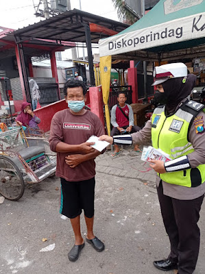 Kegiatan dipimpin Kanit Dikyasa Satlantas Polres Gresik Iptu Sri Maryani, S.Sos., bersama anggota satlantas menyambangi langsung warga masyarakat yang beraktifitas di Pasar Sidomoro, Gresik untuk memberikan himbauan kepada masyarakat yang beraktifitas di pasar, wajib memakai masker dan wajib menerapkan protokol kesehatan.