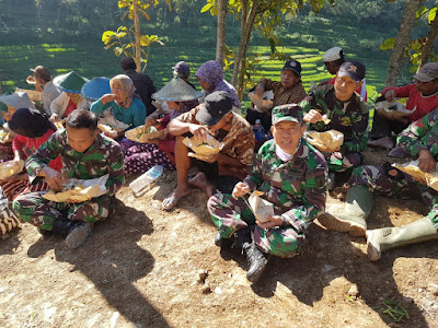 Tidak hanya itu, anggota Satgas TNI Manunggal membangun desa TMMD juga berkumpul sambil menikmati makanan khas pedesaan rebusan telo rambat yang dibawakan oleh salah satu warga. Kurang lebih 15 menit mereka beristirahat di bawah pohon.” ungkap Serda Suparno, salah satu anggota Satgas TMMD, Rabu, (30/06/2021).