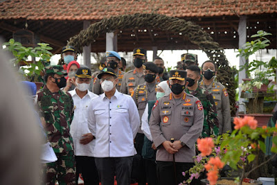 Panglima TNI Marsekal Hadi Tjahjanto, Kapolri Jenderal Polisi Listyo Sigit Prabowo, Menteri Kesehatan (Menkes) Budi Gunadi Sadikin, dan Kepala BNPB Letjen Ganip Warsito, didampingi Forkopimda Jatim, Gubernur Jatim Khofifah Indar Parawansa, Pangdam V/Brawijaya Mayor Jenderal TNI Suharyanto dan Kapolda Jatim Irjen Pol Nico Afinta,bserta Pejabat Utama Polda Jatim, melakukan pengecekan jalannya vaksinasi yang berlangsung di Ngerowo Bening, Madiun.