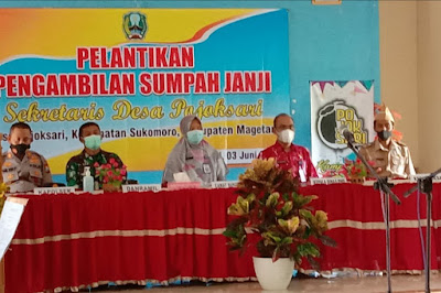Sekretaris Desa dilantik oleh Edy Mulyono Kepala Desa (Kades) Pojoksari, di Balai Desa Pojoksari, Kecamatan Sukomoro, Magetan.