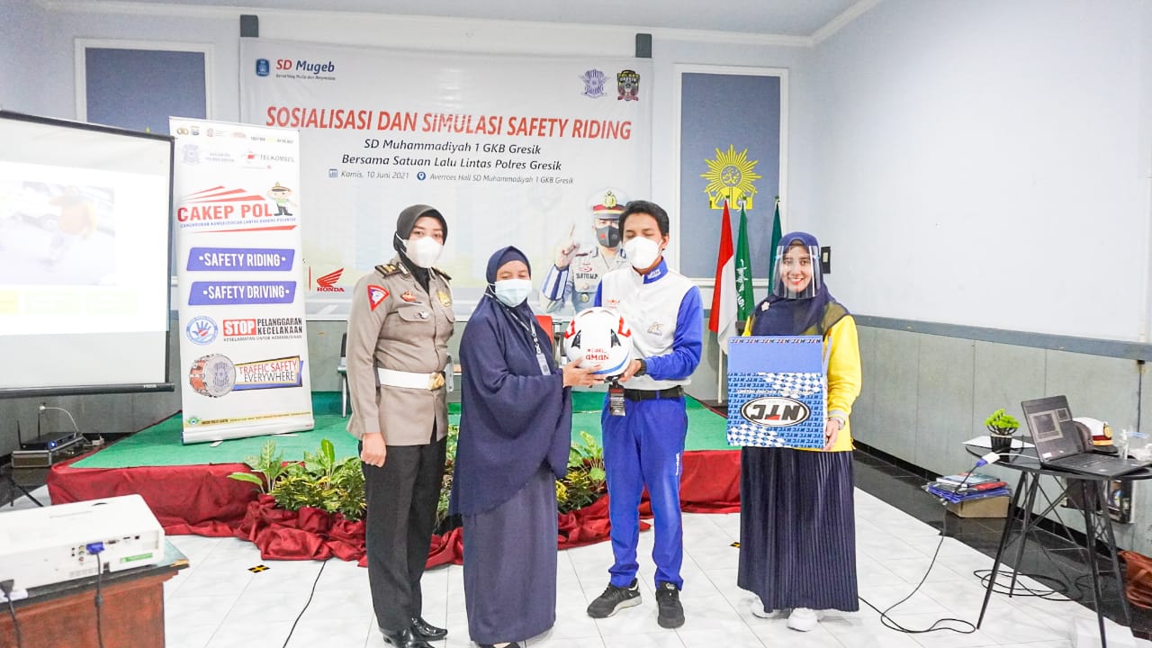 SeputarKita, Gresik – Dalam mendukung aktivitas keselamatan berkendara sejak dini,Kanit Diyaksa Satlantas Polres Gresik Iptu Yani bersama anggota memberikan sosialisasi edukasi safety riding dan simulasi ridding kepada wali murid dan guru SD Muhammadiyah Gresik Kota Baru, Kamis (10/6/2021).