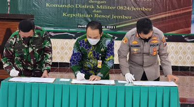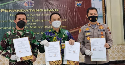 SeputarKita, Jember – Dalam Upaya Percepatan Legalisasi Aset Tanah Negara, Penandatanganan Perjanjian Kerjasama (PKS) antara Polres Jember, Kodim 0824 dengan Kantor Pertanahan Kabupaten Jember digelar di Markas Kodim 0824, Jember. Kamis (25/6/2021).