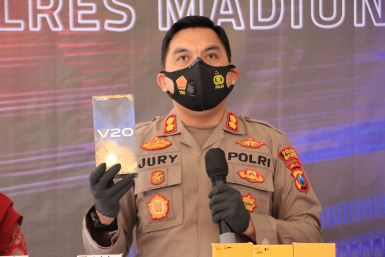 | Kapolres Madiun AKBP Jury Leonard Siahaan saat menunjukkan barang bukti Hp hasil curian |